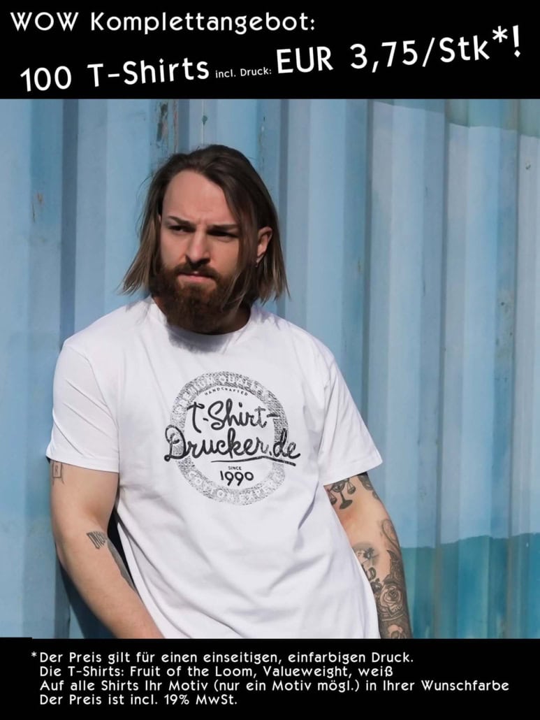 T-Shirts mittels Siebdruck zu verschönern, liefert farbintensive und dauerhafte Ergebnisse. Darauf können Sie sich verlassen. Denn wir verwenden dieses Verfahren seit 1990 und haben die Methode dabei kontinuierlich verfeinert, sodass wir Ihr persönliches Wunschmotiv mühelos auf jede Grundfarbe aufbringen können. Sie werden sehen: Ein T-Shirt oder ein anderes Kleidungsstück mit einem individuellen Motiv bedrucken zu lassen, macht ungeheuren Spaß – diese modischen Lieblingsteile tragen Sie immer wieder mit Begeisterung!